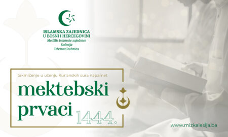 Medžlis Islamske zajednice Kalesija najavljuje organizaciju takmičenja „Mektebski prvaci 2023.“ u učenju Kur'anskih sura napamet, za redovne polaznike mektebske pouke. Polaznici mektebske...